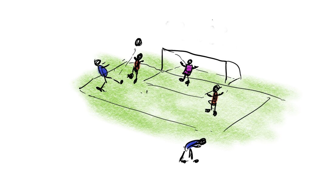 Tot ongenoegen van Jaap komt er geen bal meer goed in zijn voeten waardoor hij steeds heel hard moet lopen om de bal te bereiken. Daarna moet hij weer terug in positie zien te komen om de bal richting het doel te schieten. En…. je raad het al, hij mist steeds vaker doel.